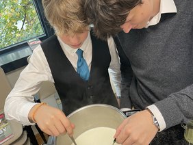 Fertig ist der selbstgemachte Frischkäse! Das Ergebnis konnte sich sehen – und vor allem schmecken – lassen. Unsere Käsekenner:innen aus dem 3. Jahrgang hatten sichtlich Spaß beim Rühren, Abschöpfen und natürlich beim Verkosten.