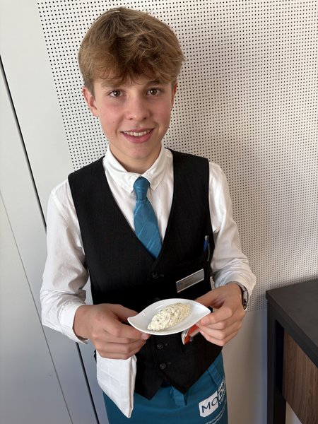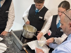 Beim Thema Milchgerinnung blieb es nämlich nicht bei der Theorie. Stattdessen wurde gleich selbst Hand angelegt. Unter fachkundiger Anleitung von Fachvorstand Didier El Senosy verwandelten die Schüler:innen Milch und Obers in frischen Frischkäse – und lernten dabei, wie einfach guter Geschmack entstehen kann.